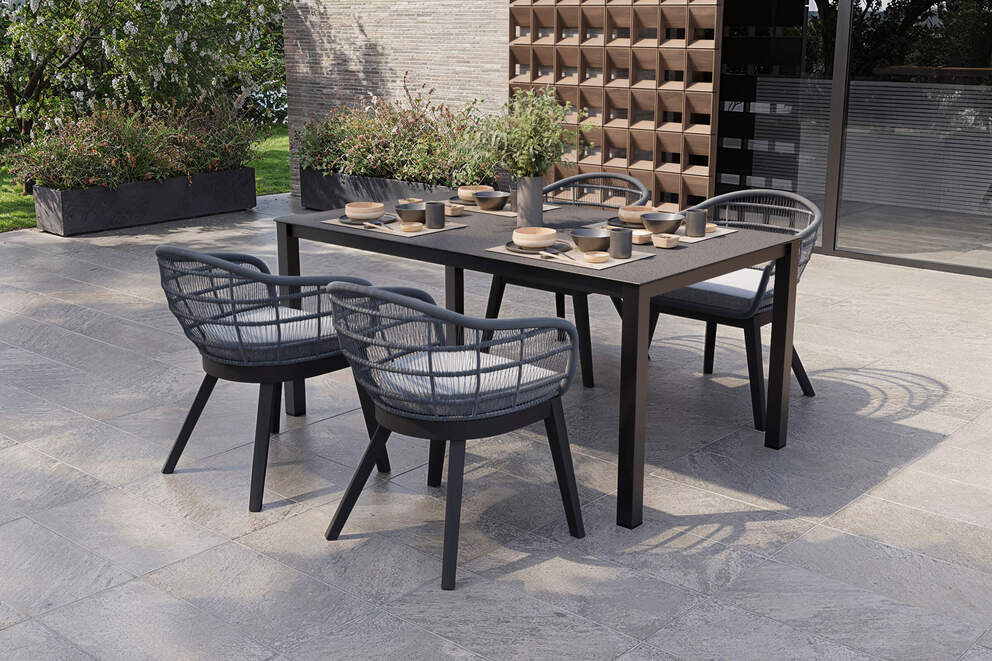 Die Materialien der Essgruppe sind speziell für den Einsatz im Außenbereich geeignet. Aluminium ist korrosionsbeständig und leicht zu bewegen, während Rope-Geflecht und Sicherheitsglas robust und pflegeleicht sind. Bodenschoner an den Stuhlbeinen schützen empfindliche Terrassen- oder Balkonböden.