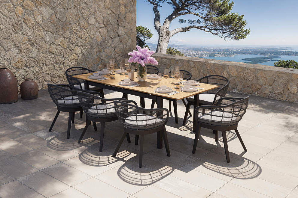 Das anthrazitfarbene Gestell in Kombination mit der naturfarbenen Teakholz-Tischplatte macht diese Essgruppe zu einem echten Blickfang. Das moderne Rope-Geflecht unterstreicht die exklusive Optik und passt in jedes Gartenambiente. |
