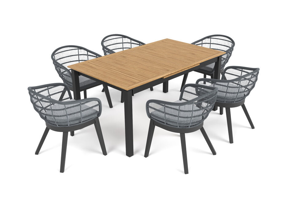 _x000D_ _x000D_Mit der OUTFLEXX Doha Garten-Essgruppe bringen Sie modernes Design und hochwertige Materialien auf Ihre Terrasse oder in Ihren Garten. Die Kombination aus stabilem Aluminiumgestell in anthrazit matt, einer natürlichen Teakholz-Tischplatte und eleganten Sesseln mit Rope-Geflecht verbindet Funktionalität mit einer warmen und zeitlosen Optik.