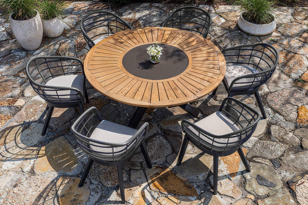 Anthrazit matt kombiniert mit naturfarbenem Teakholz verleiht Ihrem Garten eine stilvolle und zeitlose Optik. Das harmonische Zusammenspiel der Farben und Materialien macht die Essgruppe zu einem echten Blickfang, der sich nahtlos in jede Umgebung einfügt. |
