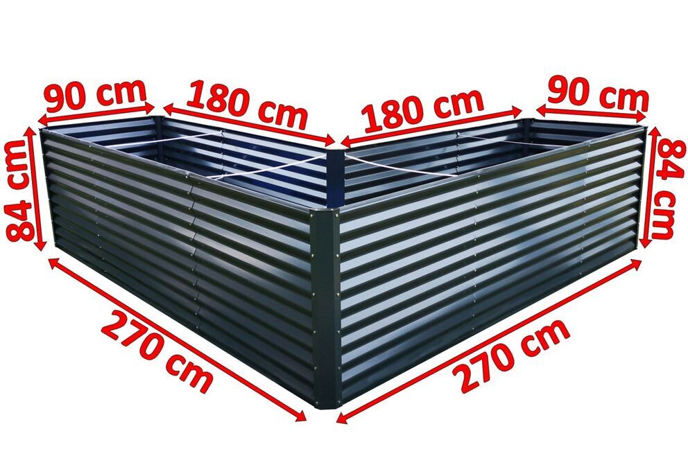 Das anthrazitfarbene Hochbeet aus dem Material Stahl mit Aluminium-Zink-Stahl Beschichtung hat die Maße von ca. 270 x 270 x 90 x 84 cm und ist dank seiner besonderen Eck-Form auch zum optischen Eingrenzen, beispielsweise von der Terrasse, bestens geeignet. Die Gummi-Ummantelung am oberen Rand des Hochbeets sorgt für ein sicheres Arbeiten am Hochbeet und die 6 nicht sichtbaren Querstreben im Hochbeet sorgen für zusätzliche Stabilität.