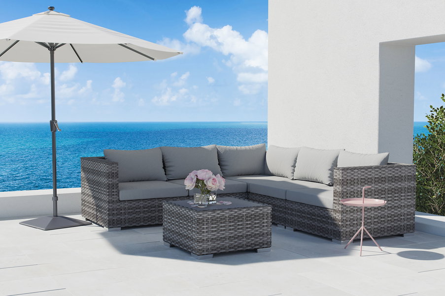 Das elegante Grau-Meliert und die Kombination aus flachem und halbrundem Polyrattan verleihen Ihrem Außenbereich eine luxuriöse und zeitgemäße Note. |