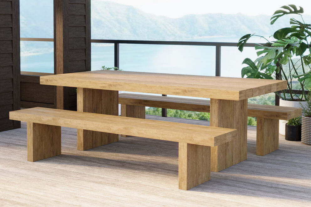 Entdecken Sie das Herzstück Ihres Gartens mit der OUTFLEXX Encino Gartenessgruppe, die Eleganz und Funktionalität in einem bietet. Hergestellt aus hochwertigem, recyceltem Teakholz, vereint dieses Set auf einzigartige Weise ökologisches Bewusstsein mit einem anspruchsvollen Design. Die natürliche, gebürstete Oberfläche der ca. 220x100 cm großen Tischplatte und der ca. 220x40 cm Bänke strahlt Wärme und Gemütlichkeit aus, während sie zugleich eine hohe Belastbarkeit und Robustheit verspricht.