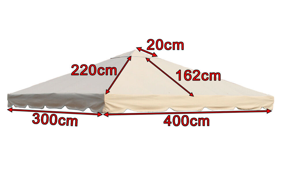 Dieses Ersatztextil für den Pavillons in der Größe von ca. 300 x 400 cm (z.B. Pavillon Sahara von Leco) ermöglicht ein neues Bespannen des Dachs. Das Textil besteht aus 100% Polyester in der Farbe Natur und ist wasserabweisend imprägniert. Dieses Pavillondach kann somit nicht nur Schatten spenden, sondern auch wetterfest überdacht werden kann. Nicht nur die hochwertigen Materialien machen dieses Dach zu einer guten Wahl, auch die gute Verarbeitung kann sich sehen lassen. Mit einem Gewicht von ca. 3,6 kg ist das Bespannen des Pavillons kein Kraftakt. Die eingenähten Gummispanner mit Haken ermöglichen ein leiches Aufziehen des neuen Dachs.
