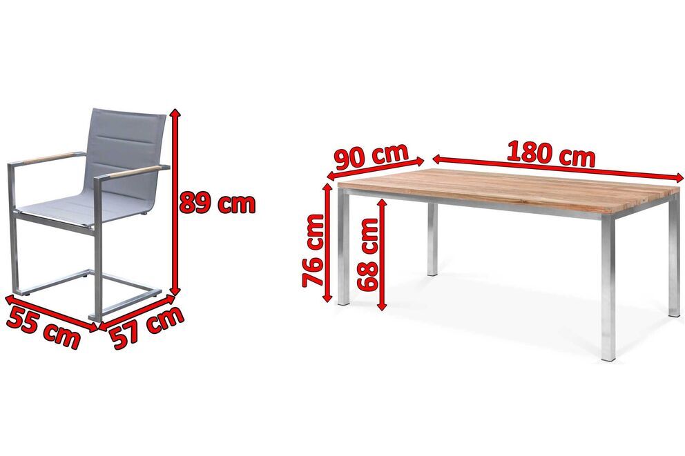 Wenn Sie sich jetzt angesprochen fühlen, sollten Sie sich diese Esstischgarnitur noch genauer anschauen. Das Set besteht aus einem Esstisch mit den Maßen von ca. 180 x 90 x 76 cm und 6 extra gepolsterten Stapelsesseln aus einer Teak/Edelstahl Kombination mit einer Textilenbespannung in der Farbe Silber.