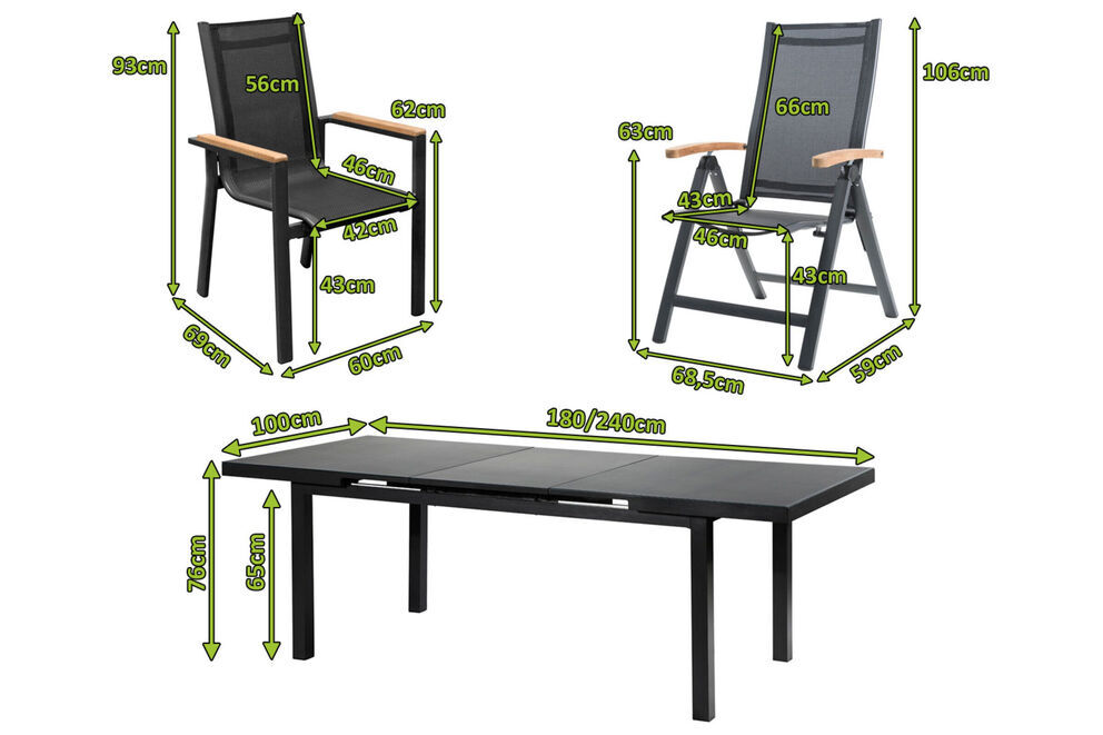 Mit Gesamtmaßen von ca. 180/240 x 100 x 76 cm ist der ca. 47 kg schwere Tisch äußerst stabil. Er verdankt seine besondere Optik der graufarbenen, rechteckigen Tischplattenoberfläche aus Alu/Einscheibensicherheitsglas. Die ca. 5 mm dicke geriffelte Tischplattenoberfläche aus Sicherheitsglas verhindert das Reflektieren von einfallendem Licht, wodurch ein matter Effekt entsteht. Der graue Siebdruck auf der Unterseite der Glasplatte sorgt für die graue Optik der Tischplatte. Sie harmoniert perfekt mit dem modernen Gestell. Die Höhe bis zur Tischunterkante beträgt ca. 65 cm. Alle Gestelle sind solide gearbeitet und bestehen aus korrosionsbeständigem Aluminium im schicken “anthrazit matt”. Die Sitz- und Rückenflächen der Sessel sind mit Textilene im passenden Schwarzton bespannt. Das Material ist unglaublich sorgt für ein herrlich luftiges Sitzgefühl, das Sie auch in der Sommerhitze nicht im Stich lässt. Hautschmeichelnde Armlehnen – aus gebürstetem, natürlichen Teakholz – schenken den Sesseln erhöhten Komfort. Die Gesamtmaße der Stapelsessel liegen jeweils bei ca. 69 x 60 x 93 cm und haben ein Gewicht von ca. 3,9 kg. Die Klappstühle wiegen jeweils ca. 5,05 kg mit Maßen von ca. 68,5 x 59 x 106 cm. Alle Sessel sind dank der hohen Qualität und erstklassigen Verarbeitung bis ca. 120 kg belastbar. Natürlich können Sie die Sitzmöbel auch kinderleicht stapeln oder zusammenklappen und bis zum nächsten Einsatz verstauen.