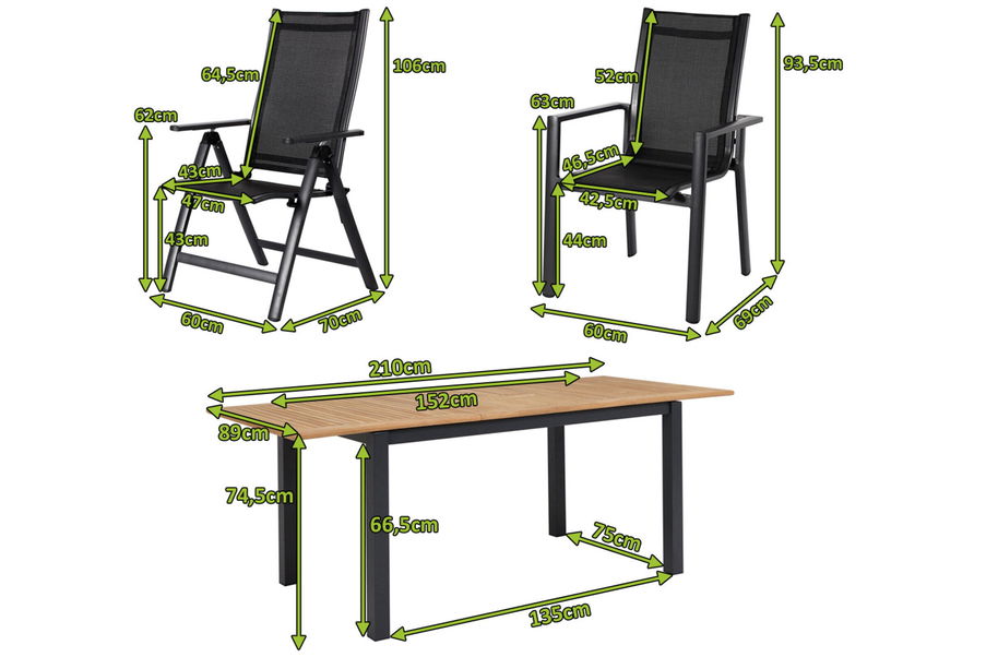 Mit Gesamtmaßen von ca. 152/210 x 89 x 74,5 cm ist der ca. 28,25 kg schwere Tisch auch äußerst stabil. Die ca. 2 cm dicke Tischplatte aus wiederverwertetem Teakholz macht diesen wunderschönen Tisch zum Blickfang. Die natürliche Wärme des Holzes verleiht dem Esstisch einen ganz besonderen Charme, der von der allmählichen Patinabildung in einem schönen Silbergrau noch unterstrichen wird. Wenn Sie der Patinabildung entgegen wirken möchten empfehlen wir Ihnen eines unserer Pflegeöle, welches Sie im Zubehör finden. Alle Gestelle sind solide gearbeitet und bestehen aus korrosionsbeständigem Aluminium im schicken “anthrazit matt”. Die Sitz- und Rückenflächen der Sessel sind mit Textilene im passenden Schwarzton bespannt. Das Material ist unglaublich sorgt für ein herrlich luftiges Sitzgefühl, das Sie auch in der Sommerhitze nicht im Stich lässt. Designstarke Armlehnen schenken den Sesseln erhöhten Komfort. Die Gesamtmaße der Stapelsessel liegen jeweils bei ca. 60 x 69 x 93,5 cm mit einem Gewicht von ca. 3,2 kg. Die Klappstühle wiegen jeweils ca. 5 kg bei Maßen von ca. 60 x 70 x 106 cm. Alle Sessel sind dank der hohen Qualität und erstklassigen Verarbeitung bis ca. 130 kg belastbar. Bei Nichtgebrauch können Sie die Sitzmöbel auch einfach stapeln oder zusammenklappen und platzsparend verstauen.