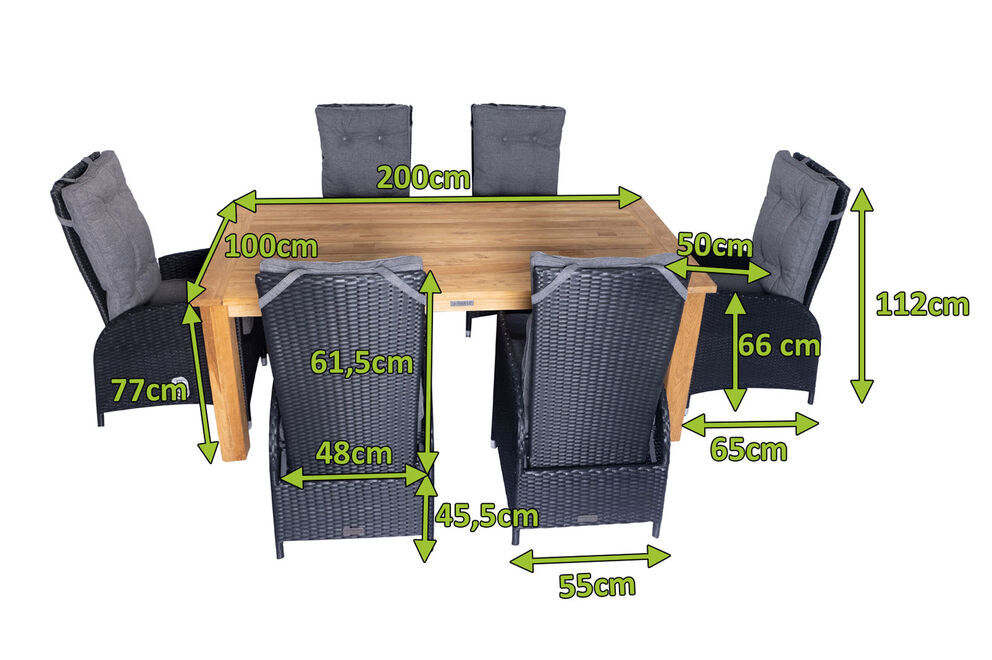Ausgefallen, natürlich und robust - diese Esstischgarnitur aus dem Hause OUTFLEXX® überzeugt durch die Kombination aus hochmodernen Polyrattanmöbeln und einem geschmackvollen Esstisch aus recyceltem Teakholz. Dieses Set enthält einen Esstisch und 6 Diningsessel in der Farbe Outflexx PremiumLine schwarz.