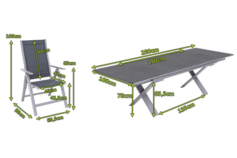 Diese Esstischgruppe von OUTFLEXX® vereint hochwertige Materialien, modernes Design und gehobenen Sitzkomfort. Das Set besteht aus einem innovativen Ausziehtisch mit Maßen von ca. 180/280 x 100 x 78 cm und 6 Klappstühlen. Genießen Sie das stylische und zugleich zeitlose Design und freuen Sie sich auf den nächsten Brunch in gepflegter Atmosphäre.