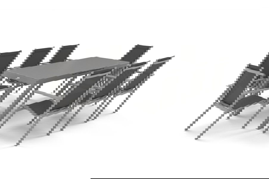 9-teilige Tischgruppe mit OUTFLEXX® Stapelsessel und Premium Ausziehtisch aus Aluminium/Textilene/Sicherheitsglas in silber/grau, für 8 Personen