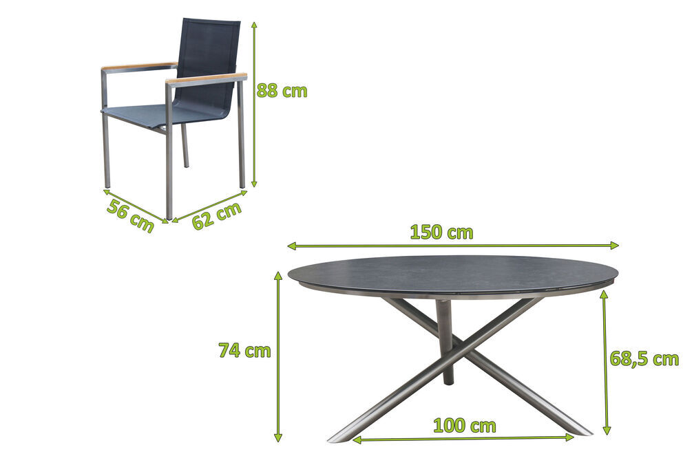 Das dreibeinige, gekreuzte Gestell des Esstisches ist gefertigt aus rostfreiem Edelstahl, welches optisch ergänzt wird durch eine hochwertige Glaskeramikplatte. Mit seinen Maßen von ca. Ø 150 x 74 cm und seinem Gewicht von ca. 49,5 kg bietet der Tisch ausreichend Platz für bis zu 4 Personen. Zum Schutz Ihrer Terrasse sind die Tischbeine zusätzlich mit Kunststofffüßen bestückt.