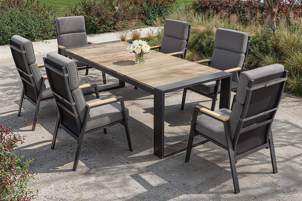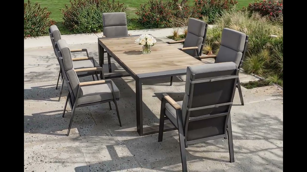 Ergänzt wird der Tisch durch sechs bequeme Stapelsessel mit verstellbarer Rückenlehne. Die stabile, rostfreie Aluminiumkonstruktion ist ebenfalls pulverbeschichtet und garantiert Wetterfestigkeit und Korrosionsschutz. Die angenehm weichen Sitz- und Rückenkissen aus 100 % Polyester in edlem Anthrazit sind inklusive und sorgen für erstklassigen Komfort. Die Armlehnen aus Teakholz setzen natürliche Akzente und bieten eine angenehm warme Haptik. Jeder Sessel misst ca. 71,5 x 59 x 106 cm und überzeugt mit einer maximalen Belastbarkeit von ca. 120 kg.