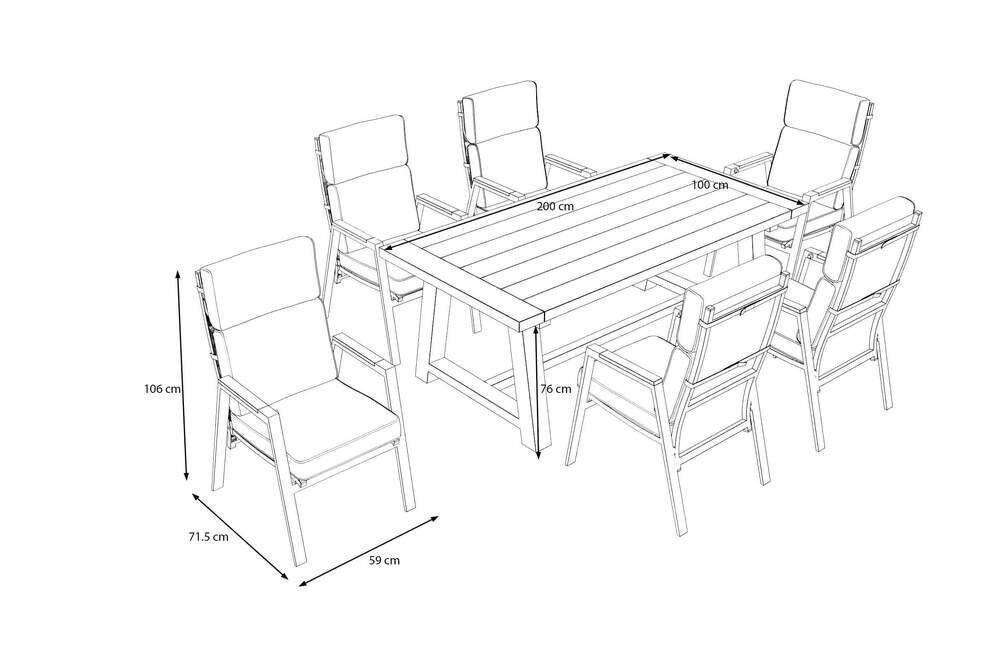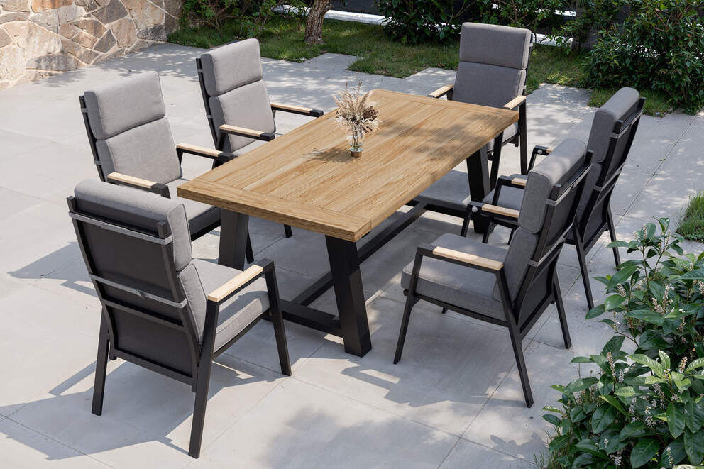 Ergänzt wird der Tisch durch sechs formschöne Stapelsessel mit moderner Linienführung. Die Aluminiumgestelle in edlem Anthrazit matt sind ebenfalls pulverbeschichtet und trotzen Wind und Wetter zuverlässig. Die Sessel lassen sich bequem stapeln und platzsparend verstauen – perfekt für kleinere Terrassen oder den Winter. Hochwertige Polster in Anthrazit mit einer Stärke von ca. 8 cm sorgen für angenehmen Sitzkomfort. Die Armlehnen sind mit Teakholz-Applikationen versehen und setzen stilvolle Akzente. Die wetterfesten Bezüge bestehen aus 100 % gesponnenem Polyester – strapazierfähig, schnelltrocknend und pflegeleicht.