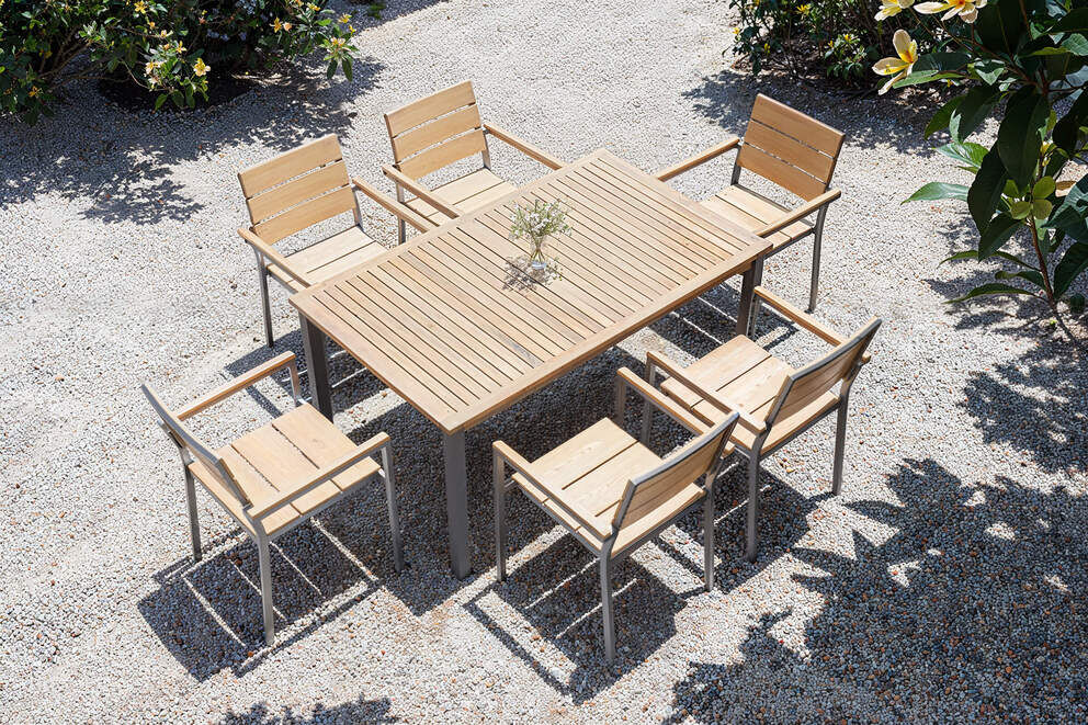 Die sechs stapelbaren Sessel sind nicht nur komfortabel, sondern auch praktisch. Mit Maßen von ca. 57 x 57 x 85 cm bieten sie eine angenehme Sitzhöhe von ca. 44,5 cm und bequeme Armlehnen in ca. 65 cm Höhe. Die Sitz- und Rückenflächen aus Teakholz passen optisch perfekt zum Tisch und bieten einen natürlichen Sitzkomfort. Das Edelstahlgestell garantiert Stabilität und macht die Stühle gleichzeitig leicht zu handhaben. Da sie stapelbar sind, können sie platzsparend verstaut werden, wenn sie nicht benötigt werden.