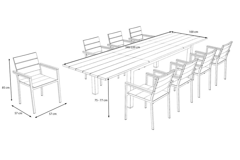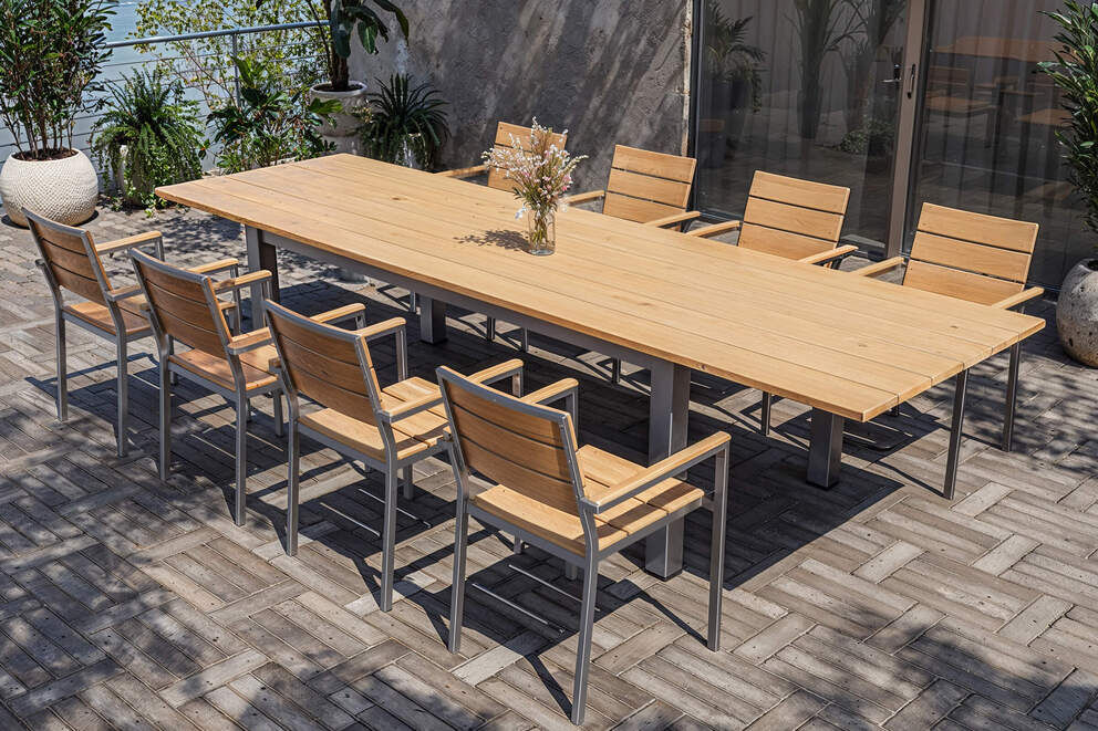 Das Herzstück dieser Essgruppe bildet der ausziehbare Tisch mit einer Länge von ca. 220 cm, der sich dank der komfortablen Ausziehfunktion auf ca. 340 cm vergrößern lässt. Mit einer Breite von ca. 100 cm und einer Höhe von ca. 75–77 cm bietet er ausreichend Platz für gesellige Runden und festliche Mahlzeiten im Freien. Die ca. 30 mm starke Tischplatte aus FSC®-zertifiziertem Teakholz wirkt edel und natürlich, während die ca. 7 x 7 cm starken Beine aus rostfreiem Edelstahl für Stabilität und ein modernes Erscheinungsbild sorgen. Das Gesamtgewicht von ca. 99 kg unterstreicht die hohe Wertigkeit und Robustheit dieses Tisches.