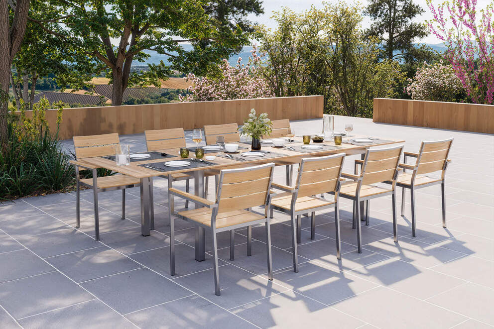 OUTFLEXX Falun Garten-Essgruppe aus Edelstahl/Teakholz, ausziehbarer Tisch, stapelbare Sessel, FSC®-zertifiziert