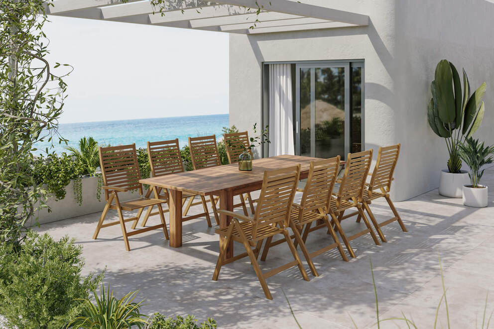 Ergänzt wird das Set durch acht komfortable Klappstühle aus derselben langlebigen FSC®-Akazie. Die Stühle lassen sich platzsparend zusammenklappen und bieten dank der 5-fach verstellbaren Rückenlehne sowie ergonomisch geformten Sitzflächen besten Sitzkomfort. Die Maße der Stühle betragen ca. 70,5 x 59,5 x 107,5 cm (L/B/H), wobei die Sitzhöhe bei ca. 41,5 cm liegt. Armlehnen und Rückenlehne sind ebenfalls optimal auf komfortables Sitzen im Außenbereich ausgelegt. Jeder Stuhl ist bis ca. 110 kg belastbar und wird vollständig montiert geliefert – für sofortigen Einsatz.