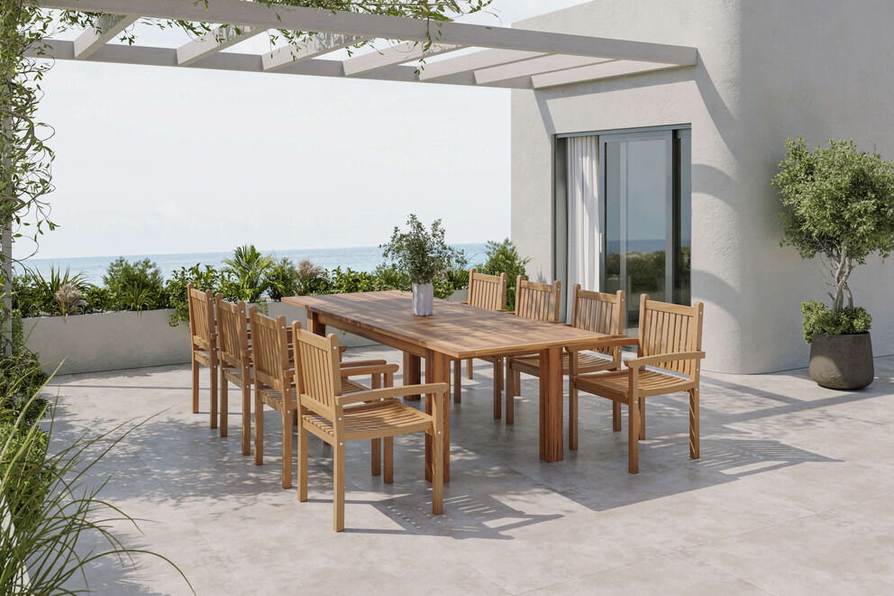 Im Zentrum des Sets steht der ausziehbare OUTFLEXX Idaho Gartentisch aus robustem Akazienholz. Mit einer Tischplatte von ca. 166cm Länge, die sich auf ca. 210cm erweitern lässt, bietet er Flexibilität für gesellige Familienessen oder spontane Gäste. Die gebürstete und geölte Oberfläche in edler Teakoptik verleiht dem Tisch eine warme Ausstrahlung und unterstreicht die natürliche Maserung des Holzes. Bodenschoner an den Tischbeinen schützen empfindliche Untergründe und sorgen für Stabilität.