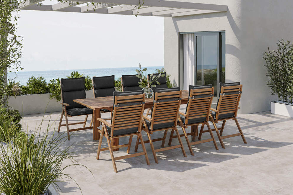 Entdecken Sie die perfekte Verbindung aus Komfort, Stil und Funktionalität mit der hochwertigen Garten-Essgruppe Faro von OUTFLEXX. Dieses großzügige Set aus einem ausziehbaren Tisch, acht komfortablen Klappstühlen und passenden Sitzkissen bietet alles, was Sie für entspannte Stunden im Freien brauchen – ob für die große Familienrunde, ein gemütliches Frühstück im Sonnenschein oder den Grillabend mit Freunden.