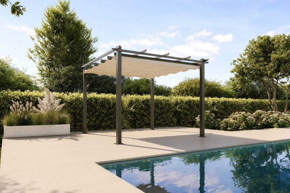 Die Flachdachpergola wird mit einem unkomplizierten Handöffnungsmechanismus geliefert, der das schnelle und einfache Auf- und Abspannen des Dachs ermöglicht. Mit einem geringen Montageaufwand können Sie die Pergola schnell aufbauen und direkt genießen. Die klaren Linien und das moderne Design fügen sich harmonisch in jeden Außenbereich ein und machen die Pergola zu einem echten Blickfang.