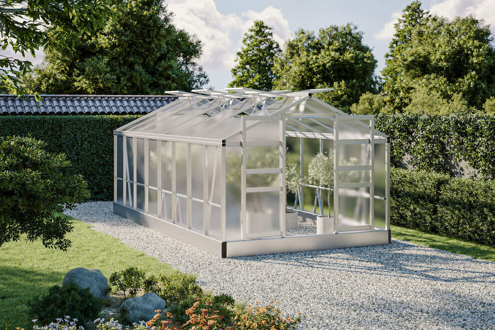 Hergestellt aus hochwertigem Aluminium in silberner Farbe ist dieses Gewächshaus nicht nur ein Blickfang, sondern auch besonders stabil und korrosionsbeständig. Dank seiner frostbeständigen und witterungsbeständigen Eigenschaften trotzt es problemlos wechselnden Wetterbedingungen und bietet optimalen Schutz für Ihre Pflanzen das ganze Jahr über. Der Innenraum mit einem großzügigen Volumen von ca. 12,25 m² eignet sich ideal für die Anzucht von Gemüse, Kräutern und Blumen.