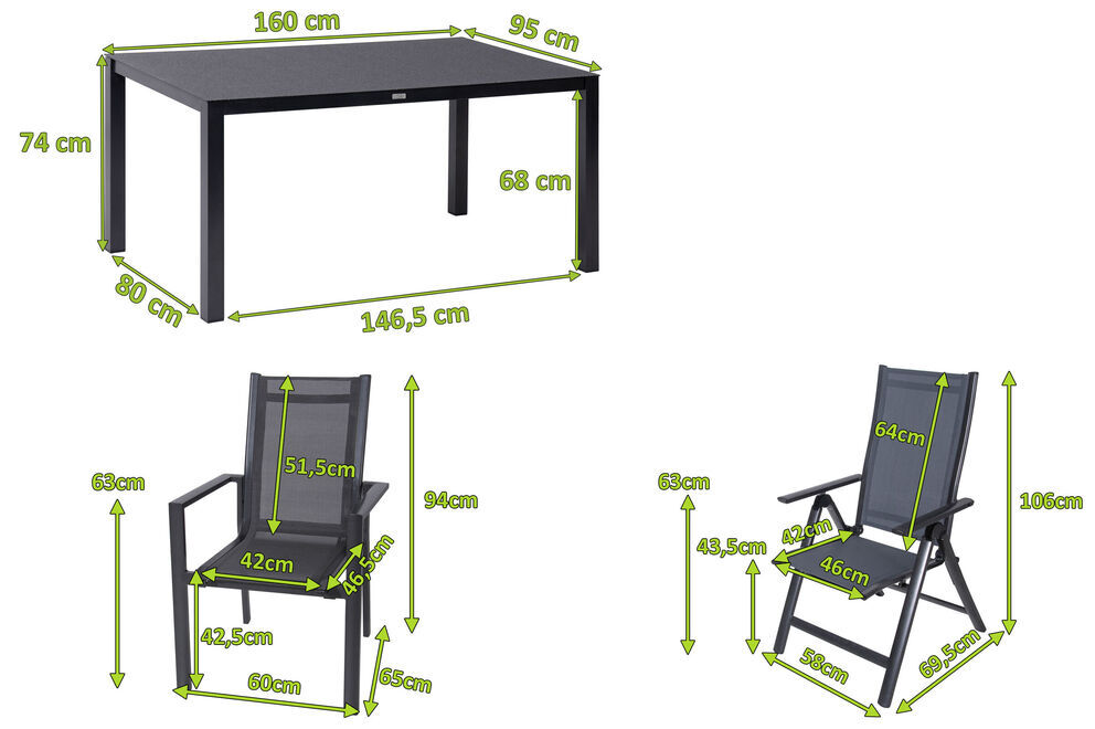Dieser praktische Esstisch bietet dank seiner Maße von ca. 160 x 95 x 74 cm großzügig Platz für sechs bis acht Personen - so steht einem gemütlichen Mittagessen mit der Familie nichts im Wege. Er wird mit einer ca. 5 mm starken Spraystone Platte geliefert. Spraystone ist ein Kunststoff-Stein-Gemisch, das bei diesem Artikel auf Sicherheitsglas aufgesprüht und anschließend eingebrannt wird. Daraus ergibt sich eine wetter- und kratzfeste sowie pflegeleichte Oberfläche in einer eleganten Natursteinoptik, die sich mit einem milden Reiniger und einem Lappen kinderleicht pflegen lässt. Die Unterschubhöhe des Tisches beträgt ca. 68 cm. Die maximale Belastbarkeit liegt bei ca. 200 kg. Das Untergestell des Möbelstücks besteht aus pulverbeschichtetem Aluminium, dies macht es nicht nur stabil, sondern sorgt auch dafür, dass es sich aufgrund des relativ geringen Gewichts von ca. 26 kg leicht hin und her stellen lässt. Wetterumschwünge und Regen machen diesem Gestell nichts aus. Rost hat keine Chance. Dieses im Trend liegende Material ist leicht, robust und stabil. Es ist pflegeleicht, wetterfest und ganzjährig für den Außeneinsatz geeignet. Kein Wunder also, dass viele der hergestellten Gartenmöbel inzwischen mit Aluminium verarbeitet werden.