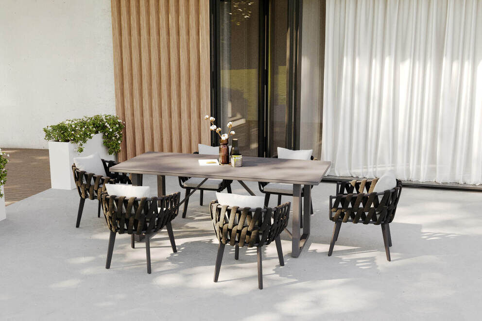 Diese hochwertige Garten-Essgruppe von OUTFLEXX kombiniert modernes Design mit langlebigen Materialien und bietet Ihnen den perfekten Ort für gesellige Stunden im Freien. Das Set besteht aus einem großzügigen Esstisch (ca. 200 x 90 cm) mit einer stilvollen Glaskeramikplatte sowie sechs bequemen JOLIET Sesseln (je ca. 64 x 57 cm) mit weichen Polstern. Dank der wetterfesten Materialien und der hochwertigen Verarbeitung ist dieses Set ideal für den ganzjährigen Einsatz auf Ihrer Terrasse oder in Ihrem Garten.