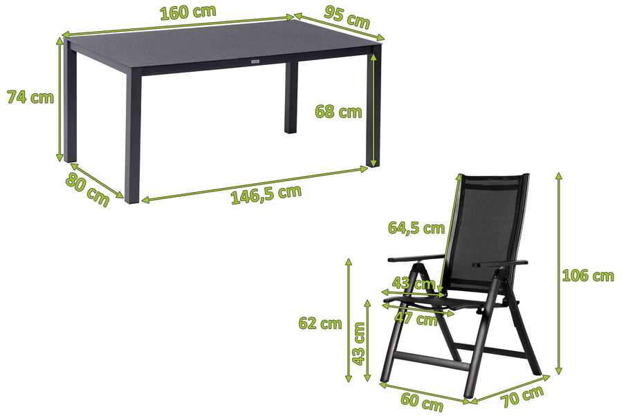 Der praktische Esstisch bietet dank seiner Maße von ca. 160 x 95 x 74 cm großzügig Platz für sechs bis acht Personen - so steht einem gemütlichen Mittagessen mit der Familie nichts im Wege. Er wird mit einer ca. 12 mm starken Spraystone Platte geliefert. Spraystone ist ein Kunststoff-Stein-Gemisch, das bei diesem Artikel auf Sicherheitsglas aufgesprüht und anschließend eingebrannt wird. Daraus ergibt sich eine wetter- und kratzfeste sowie pflegeleichte Oberfläche in einer eleganten Natursteinoptik, die sich mit einem milden Reiniger und einem Lappen kinderleicht pflegen lässt. Die Unterschubhöhe des Tisches beträgt ca. 68 cm. Die maximale Belastbarkeit liegt bei ca. 200 kg. Die schlichte Optik mit dem pulverbeschichteten Aluminiumrahmen in OUTFLEXX® anthrazit matt in Kombination mit dem schwarzen Textilen-Gewebe macht diesen dazu kombinierten Klappstühle zu einem echten Hingucker. Auch funktional überzeugt dieser bequeme Gartensessel: Die Rückenlehne lässt sich kinderleicht in 7 Stufen verstellen und bietet damit einen hervorragenden Sitzkomfort. Dank des pulverbeschichteten Aluminiumgestells ist der Sessel zudem leicht und einfach zu transportieren. Die verwendeten Materialien sind extrem witterungsbeständig und pflegeleicht, daher können sie auch bei schlechtem Wetter ohne Probleme auf Ihrer Terrasse stehen bleiben. Falls der Sessel aber doch mal weggeräumt werden soll, kann er schnell und einfach zusammengeklappt und platzsparend verstaut werden. Die Textilenbespannung ist beständig gegen UV-Strahlung, sodass die Farben lange frisch aussehen. Außerdem trocknet sie nach einem kurzen Schauer sehr schnell. Zum Schutz Ihrer Terrasse ist der Sessel mit Fußkappen ausgestattet, welche unschöne Kratzer vermeiden.