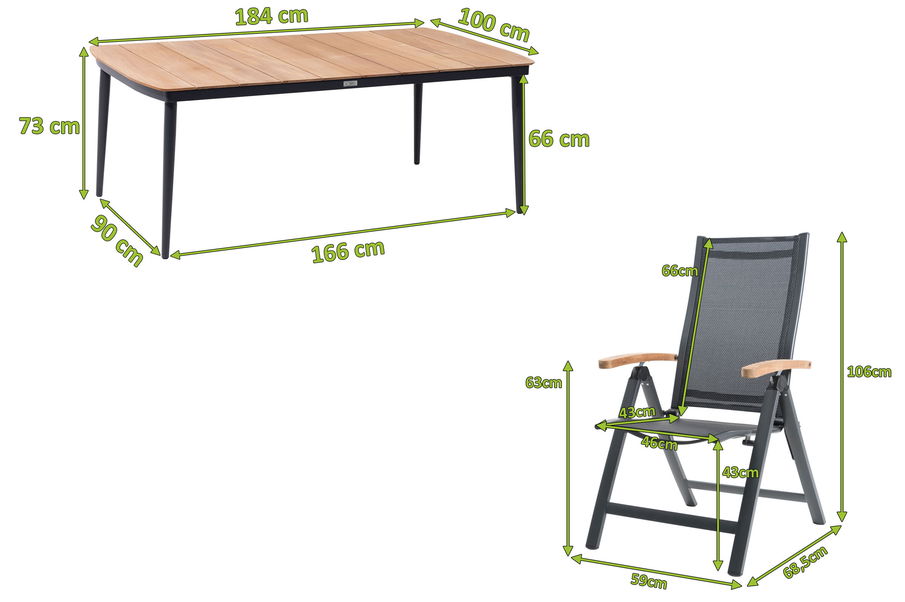 Ihr neuer Sessel ist nicht nur äußerst witterungsbeständig, sondern auch pflegeleicht. Die Pulverbeschichtung des Aluminiumgestells verleiht ihm zudem besondere Stoß-, Schlag- und Kratzfestigkeit. Das Outdoorgewebe der zweigeteilten Rücken- und Sitzfläche (Textilene) besteht aus 100 % Polyester, ist besonders UV-beständig, reißfest und verliert nie seine Form. Das Material trocknet zudem sehr schnell, weshalb auch Regenschauer Ihr Gartenvergnügen nur kurz unterbrechen. Das robuste Teakholz ist ebenfalls witterungsbeständig und hält sowohl Hitze und Frost, als auch Regen und Feuchtigkeit aus. Es hat außerdem einen natürlichen Schutz gegen Pilze und andere Schädlinge aufgrund des hohen Anteils an holzeigenen Ölen, sodass sich die Pflege auf ein Minimum beschränkt. Mit etwas Wasser lassen sich auch oberflächliche Verschmutzungen leicht direkt entfernen, so bleibt Ihnen mehr Zeit für die angenehmen Tätigkeiten in Ihrem Garten. Die zusätzlichen Fußkappen bieten Schutz für das Gestell und vermeiden zugleich unschöne Kratzer auf Ihrer Terrasse.