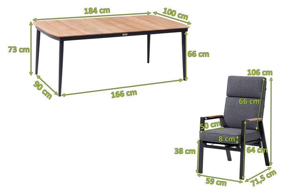 Die passenden bequemem Sessel verfügen über ein Gestell aus pulverbeschichtetem Aluminium und die Sitz- und Rückenfläche ist mit Textilen-Gewebe bespannt. Mit den Maßen von ca. 71,5 x 59 x 106 cm und einem Gewicht von ca. 7,6 kg bieten diese Sessel genügend Platz, um es sich so richtig gemütlich zu machen. Abgerundet werden die gemütlichen Stunden durch die komfortablen aus gesponnenem Polyester gefertigten anthraziten Sitz- und Rückenpolster mit einer Dicke von ca. 5 cm, sodass Sie gar nicht mehr aufstehen möchten. Die Bezüge der Polster sind abnehmbar und können auch gewaschen werden, falls diese einmal dreckig werden. Die angepasste Sitzhöhe inklusive Polster von ca. 46 cm bringt Ihre Sitzgelegenheiten in perfektem Einklang zu jedem Esstisch.