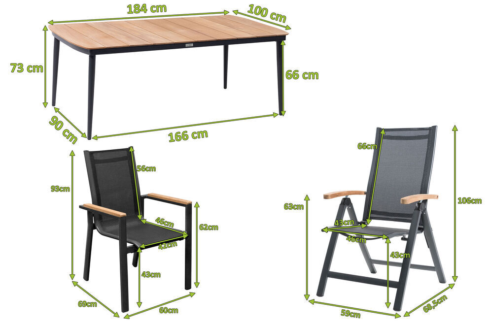 Die dazu kombinierten Sessel sind mit Maßen von ca. 69 x 60 x 93 cm mit bis zu ca. 120 kg belastbar und bieten Ihnen mit ihrer Sitzbreite von ca. 42 cm und einer Sitztiefe von ca. 46 cm auch eine großzügige Sitzfläche, die jederzeit zum Verweilen einlädt. Das Gestell besteht aus pulverbeschichtetem Aluminium im schicken OUTFLEXX anthrazit matt, während die hautschmeichelnden Armlehnen – aus gebürstetem, natürlichem Teakholz – erhöhten Komfort schenken. Bespannt wird das solide Gestell mit Textilene im passenden Schwarzton. Es ist unglaublich sorgt für ein herrlich luftiges Sitzgefühl, das Sie auch in der Sommerhitze nicht im Stich lässt. Dank des schlanken Designs und geringen Gewichtes von ca. 3,9 kg lässt sich der Sessel auch leicht transportieren, stapeln und platzsparend verstauen.