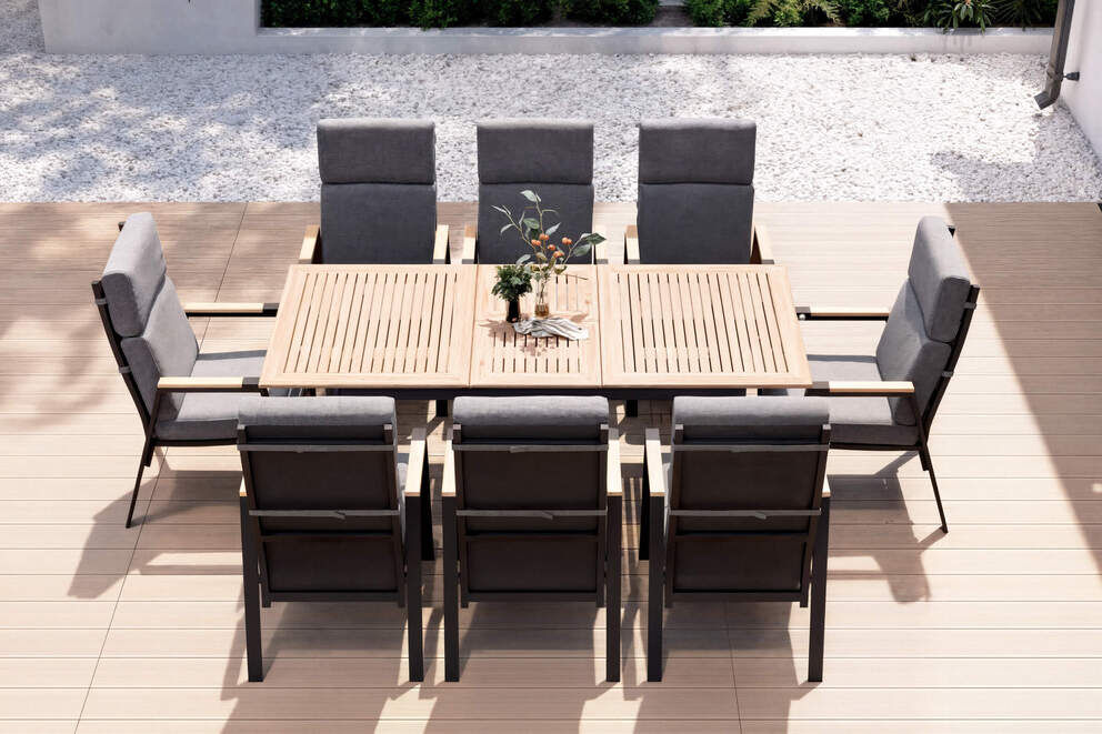 Erleben Sie mit der OUTFLEXX Esstischgarnitur eine neue Dimension des Outdoor-Luxus. Dieses exklusive Set, bestehend aus einem großzügigen Ausziehtisch und acht komfortablen Sesseln, bietet die perfekte Grundlage für unvergessliche Stunden im Freien. Jedes Element dieses Sets wurde sorgfältig aus hochwertigem Aluminium und robusten Teakholz gefertigt, um nicht nur nachhaltig, sondern auch besonders langlebig zu sein.