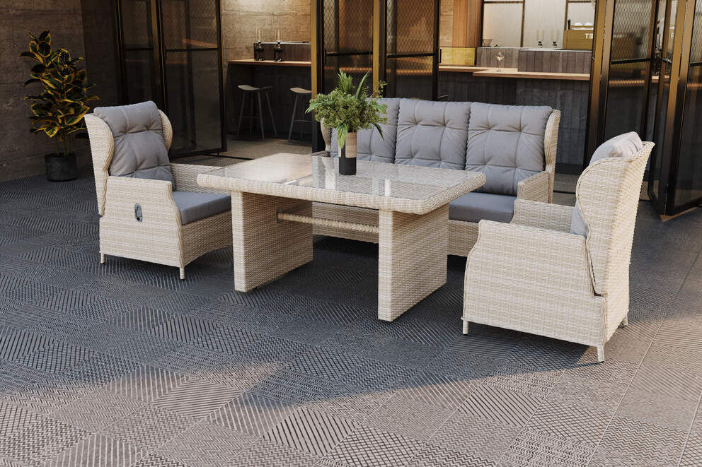 Das Set umfasst einen großzügigen 3-Sitzer sowie zwei bequeme Relaxsessel. Die ergonomisch geformten Sessel mit verstellbarer Rückenlehne laden zum entspannten Zurücklehnen ein. Dank der hochwertigen Polsterung mit bequemen Kissen in edlem Grau genießen Sie höchsten Komfort. Ob zum Essen oder Relaxen – mit diesem Set sind Sie bestens ausgestattet.