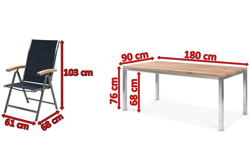 Wenn Sie sich jetzt angesprochen fühlen, sollten Sie sich diese Esstischgarnitur noch genauer anschauen. Das Set besteht aus einem Esstisch mit den Maßen von ca. 180 x 90 x 76 cm und 6 Klappstühlen aus einer Teak/Edelstahl Kombination mit einer Textilenbespannung in der Farbe Schwarz.