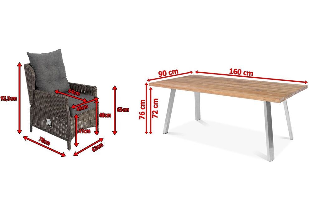 Das verwendete recycelte Teakholz verleiht dem Tisch einen ganz besonderen Charme. Die rustikal gebürstete Oberfläche sorgt dafür, dass die natürliche Struktur des Holzes erhalten bleibt und die Maserung besonders gut zum Vorschein kommt. Das Zusammenspiel aus dieser rustikalen Oberfläche und dem edlen 304er Edelstahl, verleiht dem Tisch sein besonderes Aussehen und sorgt dafür, dass er perfekt zu den Polyrattan-Sesseln passt. Mit den Maßen von ca. 160 x 90 x 76 cm bietet er ausreichend Platz für 4-6 Personen. Die Stärke der Tischplatte von ca. 4 cm und das besonders geformte Tischgestell unterstreichen das Zusammenspiel aus rustikalen und edlen Elementen zusätzlich.