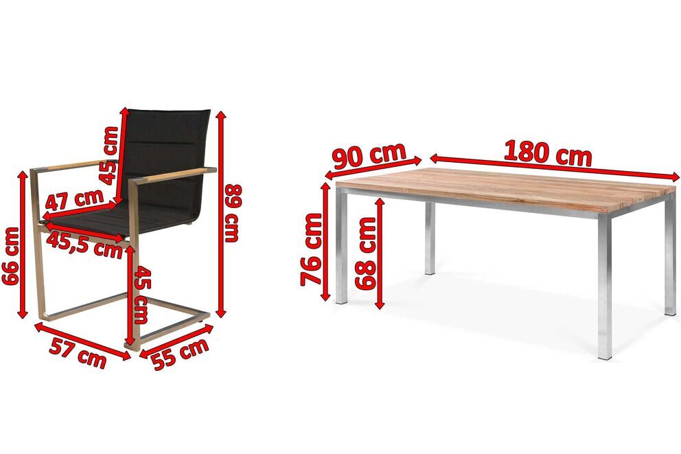Wenn Sie sich jetzt angesprochen fühlen, sollten Sie sich diese Esstischgarnitur noch genauer anschauen. Das Set besteht aus einem Esstisch mit den Maßen von ca. 180 x 90 x 76 cm und 6 extra gepolsterten Stapelsesseln aus einer Teak/Edelstahl Kombination mit einer Textilenbespannung in der Farbe Schwarz.