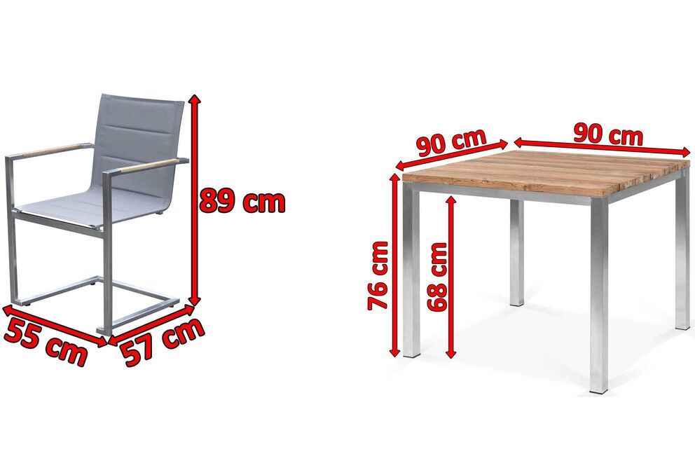 Wenn Sie sich jetzt angesprochen fühlen, sollten Sie sich diese Esstischgarnitur noch genauer anschauen. Das Set besteht aus einem Esstisch mit den Maßen von ca. 90 x 90 x 76 cm und 4 extra gepolsterten Stapelsesseln aus einer Teak/Edelstahl Kombination mit einer Textilenbespannung in der Farbe Silber.