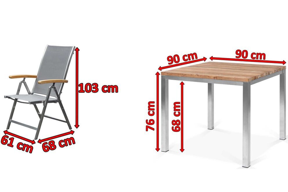 Wenn Sie sich jetzt angesprochen fühlen, sollten Sie sich diese Esstischgarnitur noch genauer anschauen. Das Set besteht aus einem Esstisch mit den Maßen von ca. 90 x 90 x 76 cm und 4 Klappstühlen aus einer Teak/Edelstahl Kombination mit einer Textilenbespannung in der Farbe Taupe.