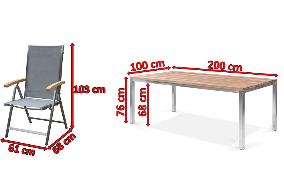 Wenn Sie sich jetzt angesprochen fühlen, sollten Sie sich diese Esstischgarnitur noch genauer anschauen. Das Set besteht aus einem Esstisch mit den Maßen von ca. 200 x 100 x 76 cm und 6 Klappstühlen aus einer Teak/Edelstahl Kombination mit einer Textilenbespannung in der Farbe Silber.