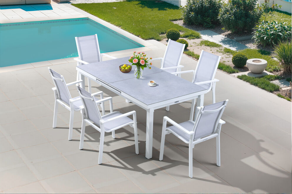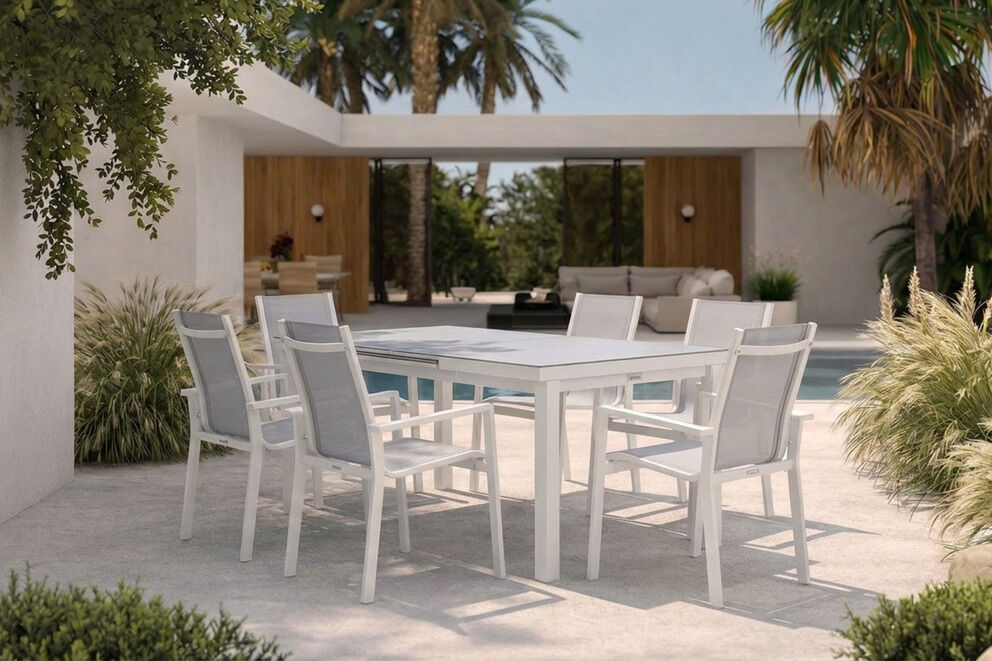 Verwandeln Sie Ihren Garten oder Ihre Terrasse in eine luxuriöse Wohlfühloase mit der hochwertigen OUTFLEXX Garten-Essgruppe. Dieses stilvolle Set, bestehend aus einem ausziehbaren Tisch und sechs stapelbaren Sesseln, überzeugt durch sein modernes Design, langlebige Materialien und höchste Funktionalität.