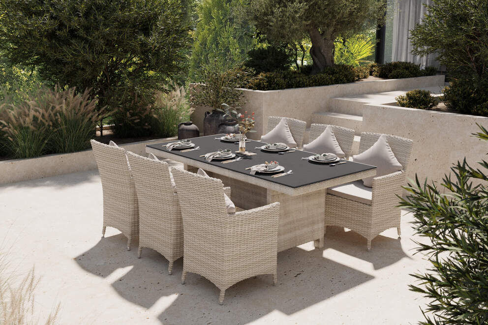 Dank robuster Materialien wie Aluminium und UV-beständigem Polyrattan ist das Set optimal für den ganzjährigen Einsatz im Freien geeignet. Die kratzfeste Spraystone-Tischplatte trotzt Wind und Wetter, ohne an Qualität zu verlieren. |