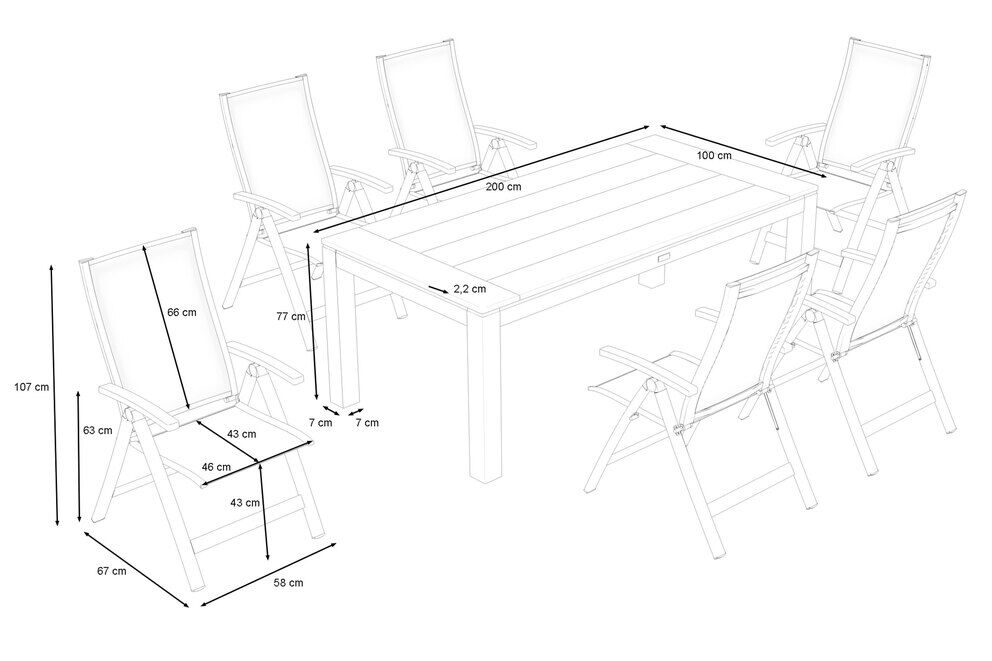 Die sechs OUTFLEXX Multipositionssessel ergänzen den Esstisch perfekt und bieten durch ihre 7-fach verstellbare Rückenlehne höchsten Sitzkomfort. Diese Sessel sind nicht nur vielseitig einsetzbar, sondern auch besonders pflegeleicht und wetterfest. Das Gestell aus anthrazitfarbenem, pulverbeschichtetem Aluminium verleiht den Sesseln eine edle Optik und macht sie gleichzeitig äußerst stabil und korrosionsbeständig. Die Sitz- und Rückenfläche aus m Textilene-Gewebe sorgt für ein angenehmes Sitzgefühl, selbst an heißen Sommertagen. Die Armlehnen in Holzoptik bieten zusätzlich eine angenehme Haptik und runden das harmonische Design ab.