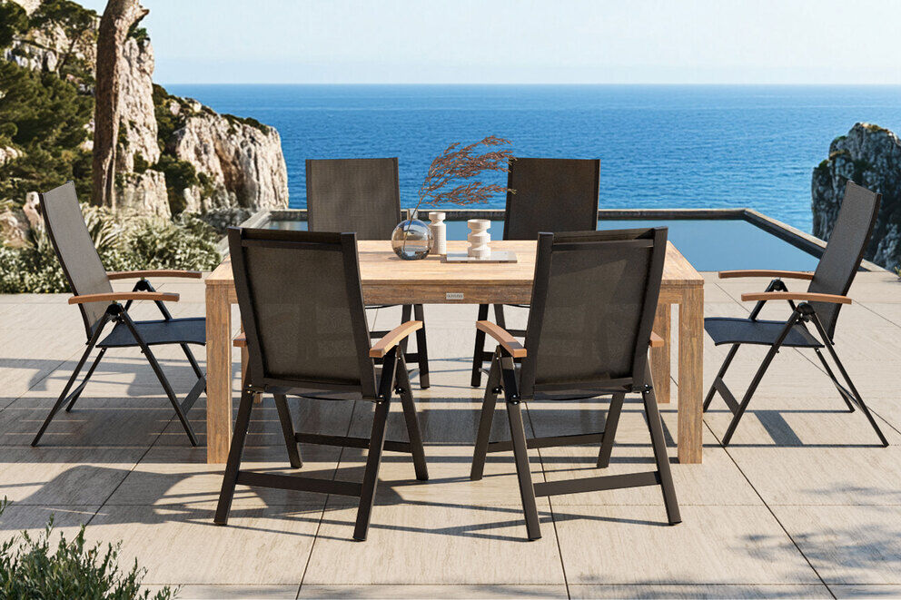 Die sechs OUTFLEXX Multipositionssessel ergänzen den Esstisch perfekt und bieten durch ihre 7-fach verstellbare Rückenlehne höchsten Sitzkomfort. Diese Sessel sind nicht nur vielseitig einsetzbar, sondern auch besonders pflegeleicht und wetterfest. Das Gestell aus anthrazitfarbenem, pulverbeschichtetem Aluminium verleiht den Sesseln eine edle Optik und macht sie gleichzeitig äußerst stabil und korrosionsbeständig. Die Sitz- und Rückenfläche aus m Textilene-Gewebe sorgt für ein angenehmes Sitzgefühl, selbst an heißen Sommertagen. Die Armlehnen in Holzoptik bieten zusätzlich eine angenehme Haptik und runden das harmonische Design ab.