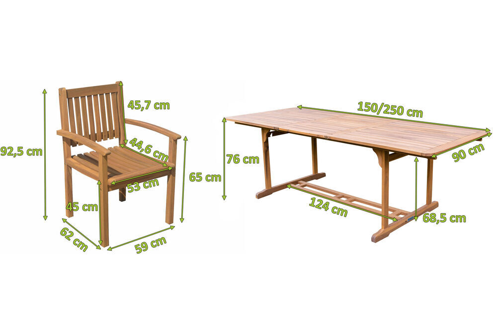 Das hochwertige Akazienholz für die Outflexx Esstischgarnitur hält nicht nur den strengen FSC-Zertifizierungsrichtlinien stand, sondern zeichnet sich außerdem durch seine extrem gute Witterungsbeständigkeit aus. Zudem besitzt Akazienholz eine besonders hohe Härte und Festigkeit - selbst Eichenholz kann da nicht mehr mithalten! Aufgrund der Vielzahl an positiven Eigenschaften ist die Outflexx Sitzgruppe perfekt für den Einsatz im Außenbereich geeignet. Das Akazienholz wurde zum Schutz vor Austrocknung und Witterungseinflüssen geölt. Um einen dauerhaften Schutz vor Verfall zu gewährleisten und zusätzlich die schöne Farbe der Holzmaserung zu erhalten, empfehlen wir Ihnen, die Holzoberfläche regelmäßig mit entsprechenden Pflegemitteln zu behandeln. Dafür ist spezielles Holzöl und Hartwachs bestens geeignet - mit diesem einfachen Trick werden Sie viele Jahre Freude an dem Outflexx Set haben. Dabei ist zu beachten, dass das Holz durch regelmäßiges ölen nachdunkeln kann.