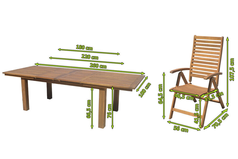 Die Esstischgarnitur besteht aus einem Esstisch mit den Maßen von ca. 180/220/260 x 100 x 76 cm sowie acht Klappstühlen. Der Akazienholztisch bietet mit seiner ca. 180 x 100 cm großen Tischplatte genügend Platz für acht Personen. Durch den Synchronauszug lässt sich der Tisch von ca. 180 cm auf ca. 220 cm oder auf ca. 260 cm ausziehen und bietet somit viel Platz. Mit einer Breite von ca. 100 cm bietet Ihnen der Tisch genügend Platz, um ausreichend bestückt zu werden. Der Tisch besitzt mit seinen ca. 76 cm eine perfekte Höhe, um komfortabel sitzen zu können. Die Tischplatte hat eine Dicke von ca. 2,7 cm. Der Tisch hat ein Gewicht von ca. 47 kg, ist bis ca. 75 kg belastbar und weist dementsprechend eine hohe Stabilität auf.
