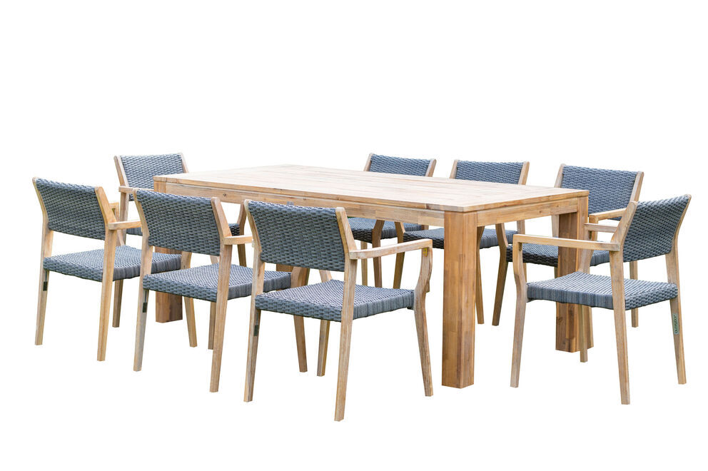 Die Esstischgarnitur besteht aus einem Esstisch mit den Maßen von ca. 200x 100 x 77 cm sowie sechs Stapelstühlen. Der Akazienholztisch bietet mit seiner ca. 200 x 100 cm großen Tischplatte genügend Platz für acht Personen. Der Esstisch wurde aus geöltem FSC-zertifizierten Akazienholz gefertigt, wodurch sie ideale, wetterfeste Materialeigenschaften aufweist.