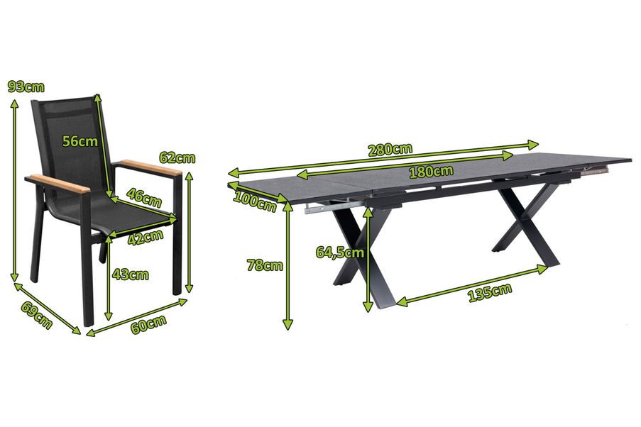 Genießen Sie ein leckeres gemeinsames Essen oder einen Spieleabend mit Ihren Lieben und lassen Sie den Alltagsstress hinter sich – hier erhält jeder einen komfortablen Sessel. Das Set besteht aus einem Esstisch und 10 dazu harmonierenden Stapelsesseln. Sein modernes Flair fügt sich sowohl im Garten als auch im Haus perfekt ein. Die Sessel sind luftig leicht und doch stabil. Für das schicke Gestell kommt korrosionsbeständiges Aluminium zum Einsatz. Bespannt wird das solide Gestell mit Textilene im passenden Schwarzton. Es ist unglaublich sorgt für ein herrliches Sitzgefühl, das Sie auch in der Sommerhitze nicht im Stich lässt. Die Gesamtmaße der Sessel liegen jeweils bei ca. 69 x 60 x 93 cm. Mit einer Sitzbreite von ca. 42 cm und einer Sitztiefe von ca. 46 cm sitzen Sie stets komfortabel. Die schicken Armlehnen aus gebürstetem, natürlichen Teakholz sorgen für zusätzlichen Komfort. Trotz des schlanken Designs und geringen Gewichtes von ca. 3,9 kg ist jeder Sessel mit bis zu ca. 120 kg belastbar. Sie können sie problemlos überall aufstellen oder zur Aufbewahrung einfach in Ihrer Garage oder Ihrem Gartenhäuschen platzsparend stapeln.