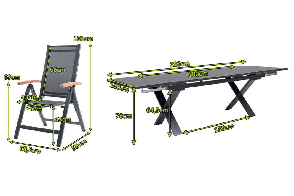 Der ca. 59,25 kg schwere Tisch mit Gesamtmaßen von ca. 180/280 x 100 x 78 cm ist äußerst stabil und mit seinem modernen X-Gestell auch sehr standhaft. Er verdankt seine besondere Optik der OUTFLEXX® anthrazit matten, rechteckigen Tischplatte aus Sicherheitsglas mit Spraystone Finish. Diese ca. 5 mm dicke Schicht verleiht der Platte einen luxuriösen und einmaligen Look. Seine Tischbeine haben längs einen Abstand von ca. 135 cm und die Höhe bis zur Tischunterkante beträgt ca. 64,5 cm. Alle Gestelle sind solide gearbeitet und bestehen aus korrosionsbeständigem Aluminium im schicken “anthrazit matt”. Die Sitzflächen der Sessel sind mit Textilene im passenden Schwarzton bespannt. Das Material ist unglaublich sorgt für ein herrlich luftiges Sitzgefühl, das Sie auch in der Sommerhitze nicht im Stich lässt. Hautschmeichelnde Armlehnen – aus gebürstetem, natürlichen Teakholz – schenken den Sesseln erhöhten Komfort. Die Gesamtmaße liegen jeweils bei ca. 68,5 x 59 x 106 cm. Mit einer Sitzbreite von ca. 46 cm und einer Sitztiefe von ca. 43 cm sitzen Sie stets bequem. Dank der hohen Qualität und erstklassigen Verarbeitung sind die ca. 5,05 kg leichten Sessel bis zu ca. 120 kg belastbar. Bei Nichtgebrauch können Sie die Sitzmöbel auch einfach zusammenklappen und platzsparend verstauen.