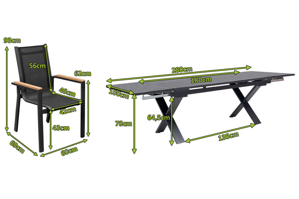 Lassen Sie den Alltag in weite Ferne rücken und genießen Sie ein leckeres gemeinsames Essen oder einen Spieleabend mit Ihren Lieben. Das Set besteht aus einem Esstisch und 6 dazu harmonierenden Stapelsesseln. Sein modernes Flair fügt sich sowohl im Garten als auch im Haus perfekt ein. Die Sessel sind luftig leicht und doch stabil. Für das schicke Gestell kommt korrosionsbeständiges Aluminium zum Einsatz. Bespannt wird das solide Gestell mit Textilene im passenden Schwarzton. Es ist unglaublich sorgt für ein herrliches Sitzgefühl, das Sie auch in der Sommerhitze nicht im Stich lässt. Die Gesamtmaße der Sessel liegen jeweils bei ca. 69 x 60 x 93 cm. Mit einer Sitzbreite von ca. 42 cm und einer Sitztiefe von ca. 46 cm sitzen Sie stets komfortabel. Die schicken Armlehnen aus gebürstetem, natürlichen Teakholz sorgen für zusätzlichen Komfort. Trotz des schlanken Designs und geringen Gewichtes von ca. 3,9 kg ist jeder Sessel mit bis zu ca. 120 kg belastbar. Sie können sie problemlos überall aufstellen oder zur Aufbewahrung einfach in Ihrer Garage oder Ihrem Gartenhäuschen platzsparend stapeln.