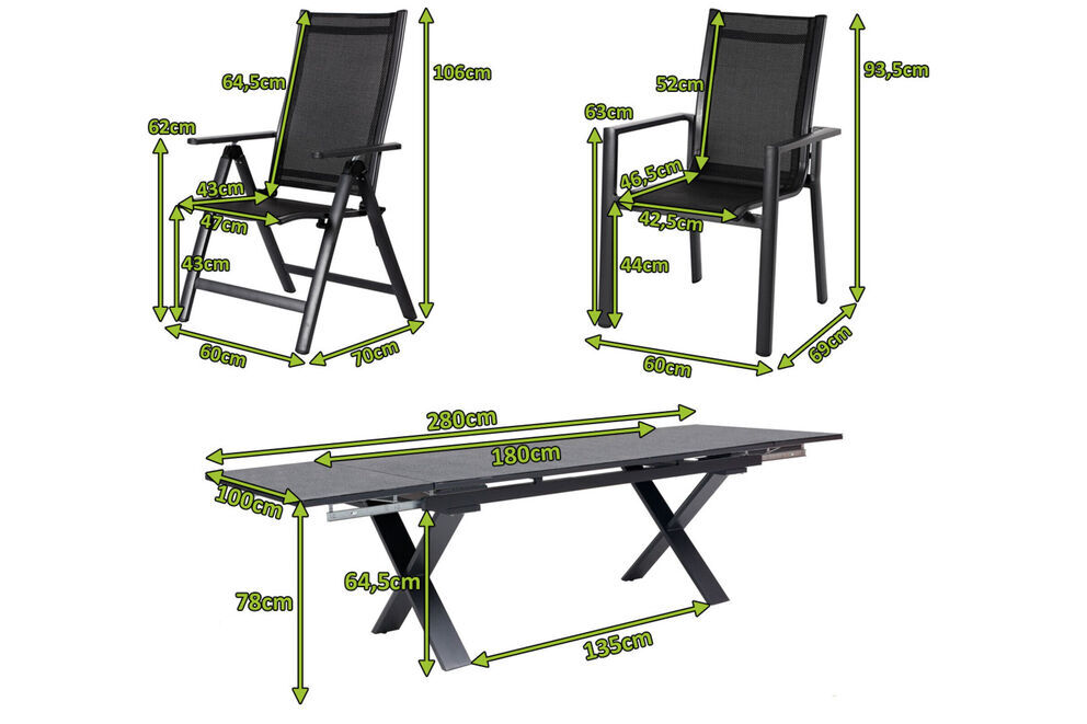 Mit einem Gewicht von ca. 59,25 kg und Gesamtmaßen von ca. 180/280 x 100 x 78 cm ist der schwere Tisch äußerst stabil. Sein gekreuztes Tischgestell aus pulverbeschichtetem Aluminium macht ihn auch sehr standhaft. Die Tischbeine haben längs einen Abstand von ca. 135 cm und die Höhe bis zur Tischunterkante beträgt ca. 64,5 cm. Die anthrazitfarbene, rechteckige Tischplatte aus Sicherheitsglas mit Spraystone Finish ergänzt das Tischgestell perfekt und verleiht dem Tisch seine besondere Optik. Alle Gestelle sind solide gearbeitet und bestehen aus korrosionsbeständigem Aluminium im schicken “anthrazit matt”. Die Sitz- und Rückenflächen der Sessel sind mit Textilene im passenden Schwarzton bespannt. Das Material ist unglaublich sorgt für ein herrlich luftiges Sitzgefühl, das Sie auch in der Sommerhitze nicht im Stich lässt. Designstarke Armlehnen schenken den Sesseln erhöhten Komfort. Die Gesamtmaße der Stapelsessel liegen jeweils bei ca. 60 x 69 x 93,5 cm mit einem Gewicht von ca. 3,2 kg. Die Klappstühle wiegen jeweils ca. 5 kg bei Maßen von ca. 60 x 70 x 106 cm. Alle Sessel sind dank der hohen Qualität und erstklassigen Verarbeitung bis ca. 130 kg belastbar. Natürlich können Sie die Sitzmöbel auch kinderleicht stapeln oder zusammenklappen und bis zum nächsten Einsatz verstauen.